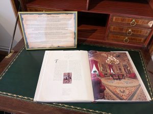 Dans le salon, on découvre aussi une photographie de la visite de l’Empereur du Japon en 1989 — signe que le château, même modeste, a gardé une certaine aura. Sur la cheminée, une tapisserie représentant Persée avec la tête de Méduse et la montagne d’Atlas vient rappeler que le classicisme s’est invité jusque dans les campagnes wallonne.